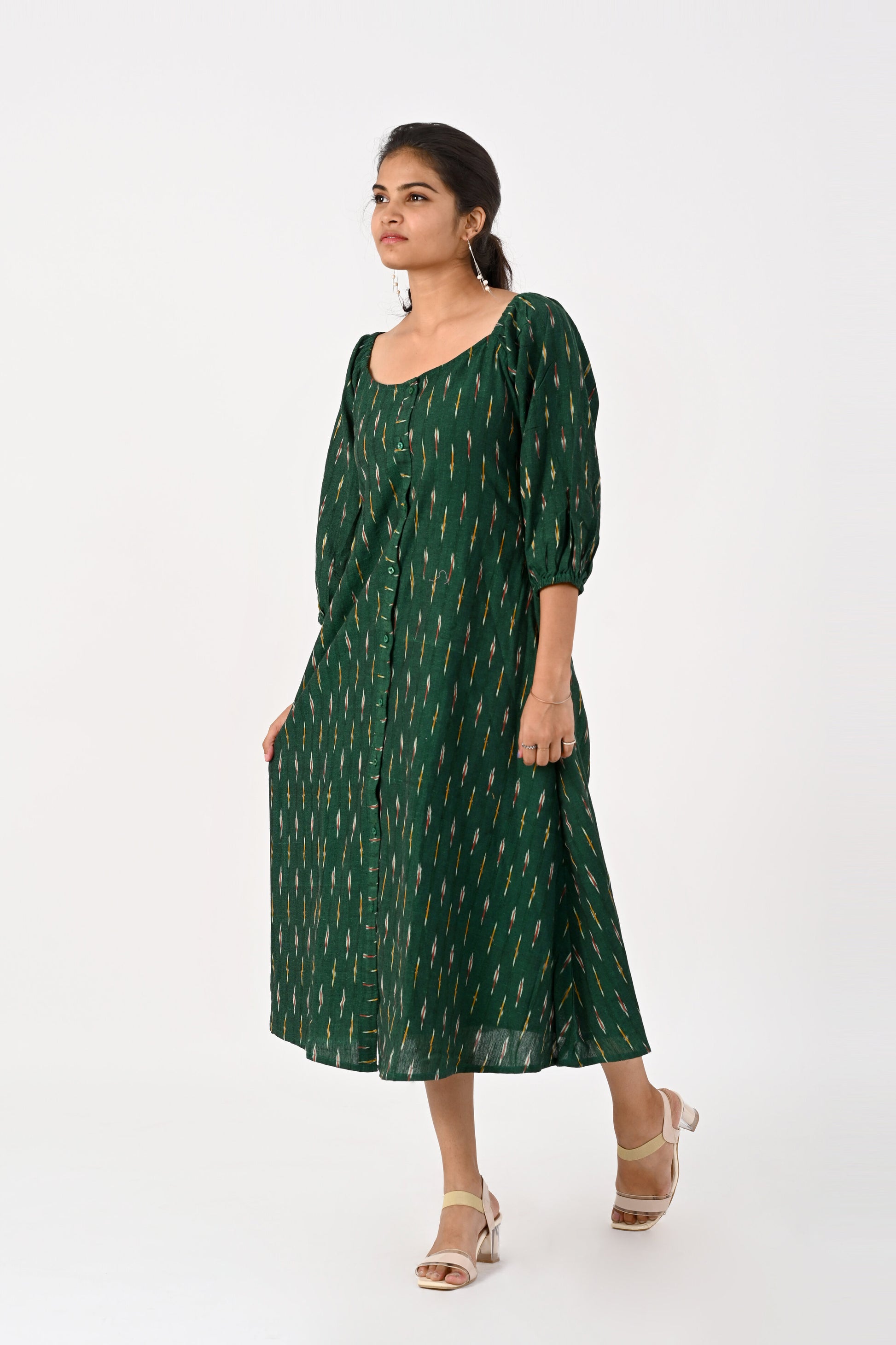 Green Ikkat Sheath Dress: A stunning portrayal of elegance and style with an intricate handwoven Ikkat pattern.