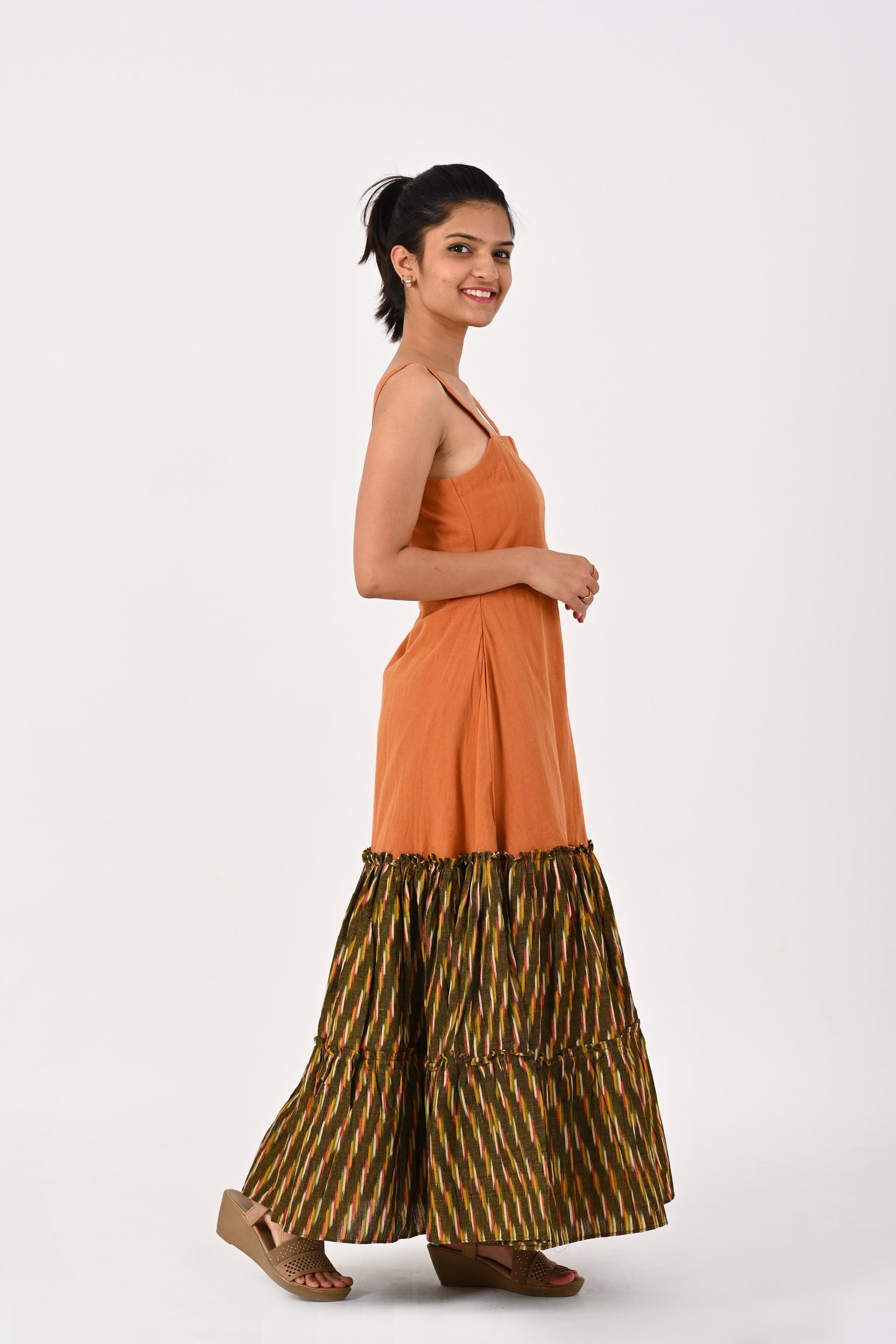 Color: Vibrant Orange and Green with Ikkat pattern.